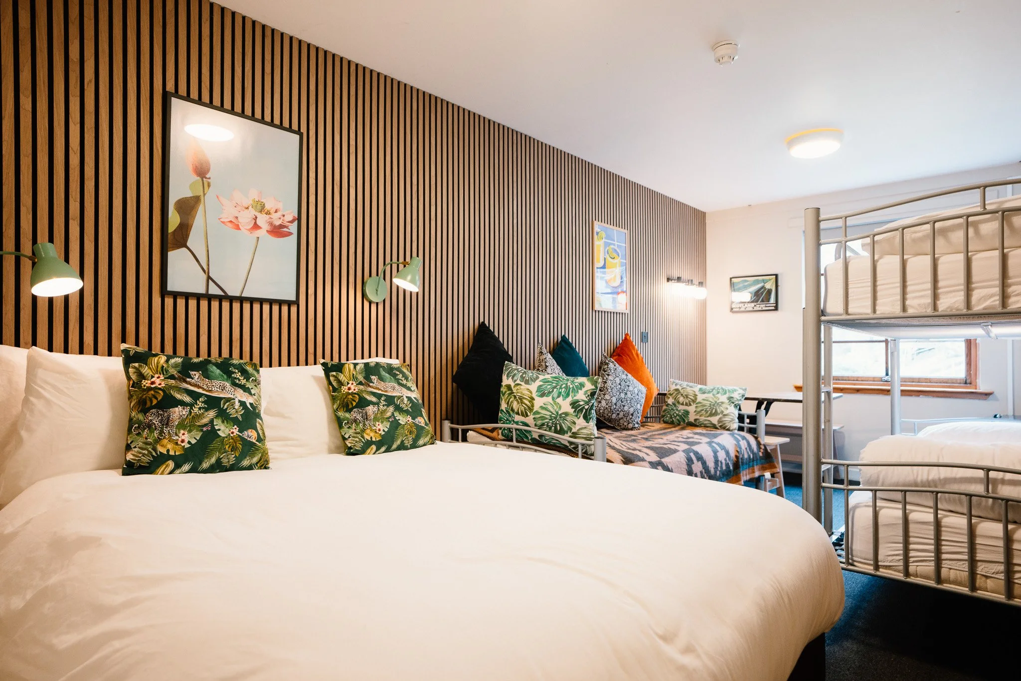 Family rooms feature a double bed plus one or two bunk sets, with most including a day bed or sofa.